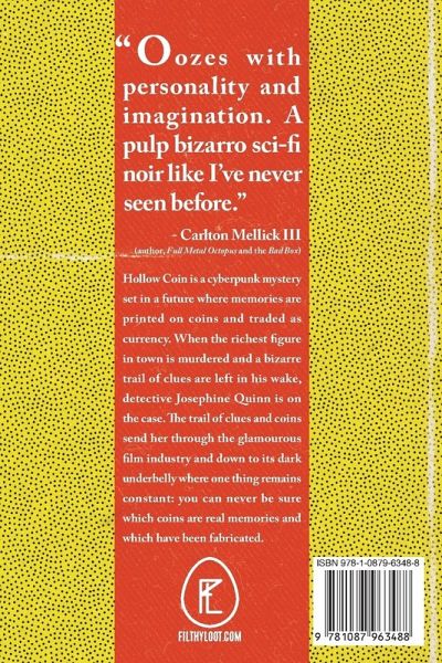 "Oozes with personality and imagination. A pulp bizarro sci-fi noir like I've never seen before."- Carlton Mellick III(author, Full Metal Octopus and the Bad Box) Hollow Coin is a cyberpunk mystery set in a future where memories are printed on coins and traded as currency. When the richest figure in town is murdered and a bizarre trail of clues are left in his wake, detective Josephine Quinn is on the case. The trail of clues and coins send her through the glamourous film industry and down to its dark underbelly where one thing remains constant: you can never be sure which coins are real memories and which have been fabricated.