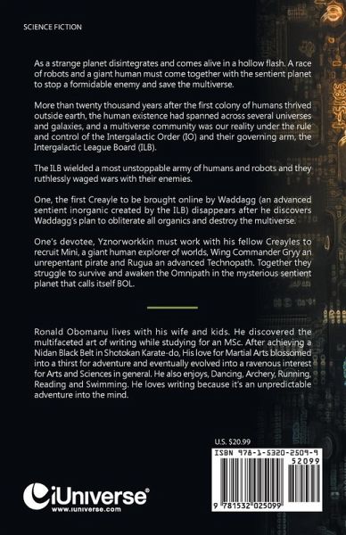 As a strange planet disintegrates and comes alive in a hollow flash. A race of robots and a giant human must come together with the sentient planet to stop a formidable enemy and save the multiverse. More than twenty thousand years after the first colony of humans thrived outside earth, the human existence had spanned across several universes and galaxies, and a multiverse community was our reality under the rule and control of the Intergalactic Order (IO) and their governing arm, the Intergalactic League Board (ILB). The ILB wielded a most unstoppable army of humans and robots and they ruthlessly waged wars with their enemies. One, the first Creayle to be brought online by Waddagg (an advanced sentient inorganic created by the ILB) disappears after he discovers Waddagg's plan to obliterate all organics and destroy the multiverse. One's devotee, Yznorworkkin must work with his fellow Creayles to recruit Mini, a giant human explorer of worlds, Wing Commander Gryy an unrepentant pirate and Rugua an advanced Technopath. Together they struggle to survive and awaken the Omnipath in the mysterious sentient planet that calls itself BOL.