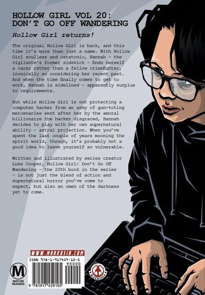 The original Hollow Girl is back, and this time it's more than just a name. With Hollow Girl soulless and catatonic, Hannah - the vigilante's former sidekick - finds herself a carer rather than a fellow crimefighter, ironically so considering her recent past. And when the time finally comes to get to work, Hannah is sidelined - apparently surplus to requirements. But while Hollow Girl is out protecting a computer hacker from an army of gun-toting mercenaries sent after her by the amoral billionaire the hacker disgraced, Hannah decides to play with her own supernatural ability - astral projection. When you've spent the last couple of years mooning the spirit world, though, it's probably not a good idea to leave yourself so vulnerable. Written and illustrated by series creator Luke Cooper, Hollow Girl: Don't Go Off Wandering - the 20th book in the series - is not just the blend of action and supernatural horror you've come to expect, but also an omen of the darkness yet to come.