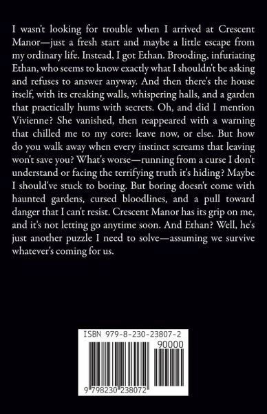I wasn't looking for trouble when I arrived at Crescent Manor-just a fresh start and maybe a little escape from my ordinary life. Instead, I got Ethan. Brooding, infuriating Ethan, who seems to know exactly what I shouldn't be asking and refuses to answer anyway. And then there's the house itself, with its creaking walls, whispering halls, and a garden that practically hums with secrets. Oh, and did I mention Vivienne? She vanished, then reappeared with a warning that chilled me to my core: leave now, or else. But how do you walk away when every instinct screams that leaving won't save you? What's worse-running from a curse I don't understand or facing the terrifying truth it's hiding? Maybe I should've stuck to boring. But boring doesn't come with haunted gardens, cursed bloodlines, and a pull toward danger that I can't resist. Crescent Manor has its grip on me, and it's not letting go anytime soon. And Ethan? Well, he's just another puzzle I need to solve-assuming we survive whatever's coming for us.