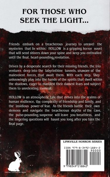 In the depths of a vast, foreboding cave, where silence whispers of unspeakable horrors, three friends embark on a treacherous journey to unravel the mysteries that lie within. HOLLOW is a gripping horror novel that will send shivers down your spine and keep you enthralled until the final, heart-pounding revelation. Driven by a desperate search for their missing friends, the trio ventures deep into the labyrinthine tunnels, unaware of the malevolent forces that await them. With each step, they unknowingly play into the hands of the spirits that dwell within the shadows, eager to manifest their darkest fears and subject them to unrelenting torment. As the friends become entangled in the never-ending maze, the boundary between reality and nightmare blurs. Their quest for answers quickly transforms into a harrowing battle for survival, as they confront their own personal demons while fighting to escape the clutches of the malicious spirits. HOLLOW is an atmospheric tale that delves into the realms of human resilience, the complexity of friendship and family, and the insidious power of fear. As the friends battle their own demons and navigate the treacherous depths of the cave, the pulse-pounding suspense will leave you breathless, and the lingering questions will haunt you long after you turn the final page. Book 4 of The Linkville Horror Series. A stand-alone series that can be read in any order.