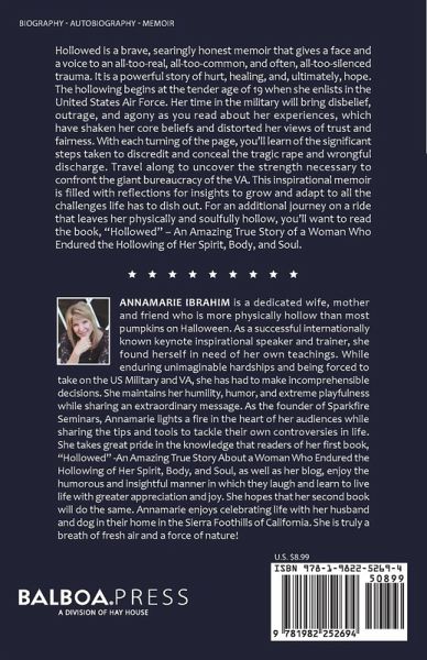 Hollowed is a brave, searingly honest memoir that gives a face and a voice to an all-too-real, all-too-common, and often, all-too-silenced trauma. It is a powerful story of hurt, healing, and, ultimately, hope. The hollowing begins at the tender age of 19 when she enlists in the United States Air Force. Her time in the military will bring disbelief, outrage, and agony as you read about her experiences, which have shaken her core beliefs and distorted her views of trust and fairness. With each turning of the page, you'll learn of the significant steps taken to discredit and conceal the tragic rape and wrongful discharge. Travel along to uncover the strength necessary to confront the giant bureaucracy of the VA. This inspirational memoir is filled with reflections for insights to grow and adapt to all the challenges life has to dish out. For an additional journey on a ride that leaves her physically and soulfully hollow, you'll want to read the book, "Hollowed" - An Amazing True Story of a Woman Who Endured the Hollowing of Her Spirit, Body, and Soul.