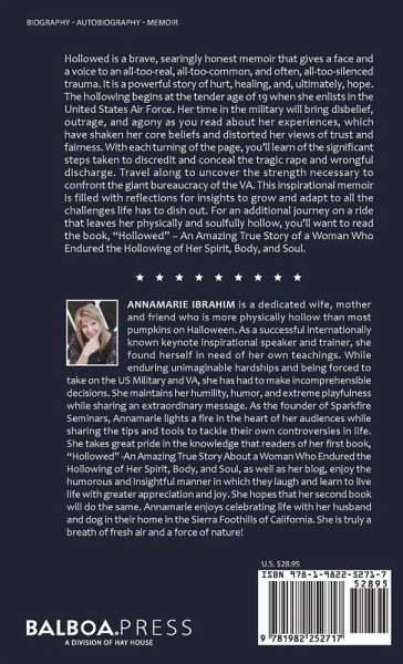 Hollowed is a brave, searingly honest memoir that gives a face and a voice to an all-too-real, all-too-common, and often, all-too-silenced trauma. It is a powerful story of hurt, healing, and, ultimately, hope. The hollowing begins at the tender age of 19 when she enlists in the United States Air Force. Her time in the military will bring disbelief, outrage, and agony as you read about her experiences, which have shaken her core beliefs and distorted her views of trust and fairness. With each turning of the page, you'll learn of the significant steps taken to discredit and conceal the tragic rape and wrongful discharge. Travel along to uncover the strength necessary to confront the giant bureaucracy of the VA. This inspirational memoir is filled with reflections for insights to grow and adapt to all the challenges life has to dish out. For an additional journey on a ride that leaves her physically and soulfully hollow, you'll want to read the book, "Hollowed" - An Amazing True Story of a Woman Who Endured the Hollowing of Her Spirit, Body, and Soul.