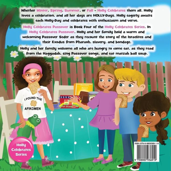 Whether Winter, Spring, Summer, or Fall - Holly Celebrates them all. Holly loves a celebration, and all her days are HOLLY-Days. Holly eagerly awaits each Holly-Day and celebrates with enthusiasm and verve. Holly Celebrates Passover is Book Four of the Holly Celebrates Series. In Holly Celebrates Passover, Holly and her family hold a warm and welcoming Passover Seder as they recount the story of the Israelites and their Exodus from Pharaoh, slavery, and bondage. Holly and her family welcome all who are hungry to come eat, as they read from the Haggadah, sing Passover songs, and eat matzah ball soup.
