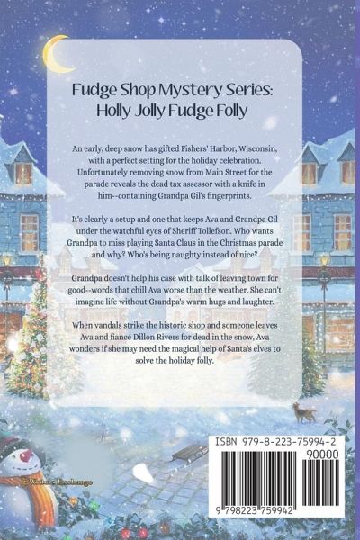 An early, deep snow has gifted Fishers' Harbor, Wisconsin, with a perfect setting for the holiday celebration. Unfortunately removing snow from Main Street for the parade reveals the dead tax assessor with a knife in him--containing Grandpa Gil's fingerprints. It's clearly a setup and one that keeps Ava and Grandpa Gil under the watchful eyes of Sheriff Tollefson. Who wants Grandpa to miss playing Santa Claus in the Christmas parade and why? Who's being naughty instead of nice? Grandpa doesn't help his case with talk of leaving town for good--words that chill Ava worse than the weather. She can't imagine life without Grandpa's warm hugs and laughter. When vandals strike the historic shop and someone leaves Ava and fiancé Dillon Rivers for dead in the snow, Ava wonders if she may need the magical help of Santa's elves to solve the holiday folly.