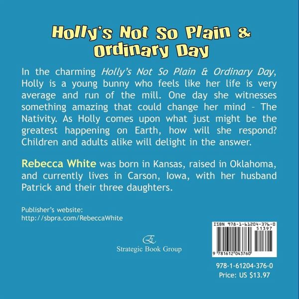 In the charming Holly's Not So Plain & Ordinary Day, Holly is a young bunny who feels like her life is very average and run of the mill. One day she witnesses something amazing that could change her mind - The Nativity. As Holly comes upon what just might be the greatest happening on Earth, how will she respond? Children and adults alike will delight in the answer. Rebecca White was born in Kansas, raised in Oklahoma, and currently lives in Carson, Iowa, with her husband Patrick and their three daughters. Publisher's website: http://sbpra.com/RebeccaWhite