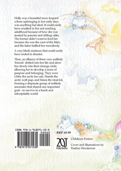 Holly is a beautiful snow leopard whose upbringing in her early days was anything but ideal. It could easily have resulted in her not reaching adulthood because of how she was treated by parents and siblings alike. The former didn't want to feed her because she was the runt of the litter, and the latter bullied her mercilessly. A very bleak existence that could easily have ended in disaster. Then, an alliance of three very unlikely 'friends' drifted into her life and drew her slowly into their strange circle, allowing her to develop a sense of purpose and belonging. They were Libby the arctic fox cub, Niamh the arctic wolf pup, and Maria the stoat kit, forming a disparate group of unlikely associates that shared one important goal - to survive in a harsh and inhospitable world.