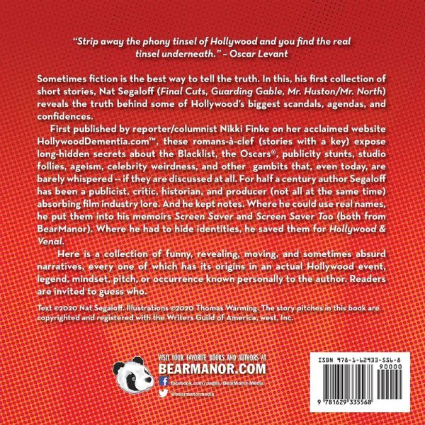 "Strip away the phony tinsel of Hollywood and you find the real tinsel underneath." - Oscar Levant Sometimes fiction is the best way to tell the truth. In this, his first collection of short stories, Nat Segaloff (Final Cuts, Guarding Gable, Mr. Huston/Mr. North) reveals the truth behind some of Hollywood's biggest scandals, agendas, and confidences. First published by reporter/columnist Nikki Finke on her acclaimed website HollywoodDementia.com(TM), these romans-à-clef (stories with a key) expose long-hidden secrets about the Blacklist, the Oscars®, publicity stunts, studio follies, ageism, celebrity weirdness, and other gambits that, even today, are barely whispered -- if they are discussed at all. For half a century author Segaloff has been a publicist, critic, historian, and producer (not all at the same time) absorbing film industry lore. And he kept notes. Where he could use real names, he put them into his memoirs Screen Saver and Screen Saver Too (both from BearManor). Where he had to hide identities, he saved them for Hollywood & Venal. Here is a collection of funny, revealing, moving, and sometimes absurd narratives, every one of which has its origins in an actual Hollywood event, legend, mindset, pitch, or occurrence known personally to the author. Readers are invited to guess who. Text ©2020 Nat Segaloff. Illustrations ©2020 Thomas Warming. The story pitches in this book are copyrighted and registered with the Writers Guild of America, west, Inc.