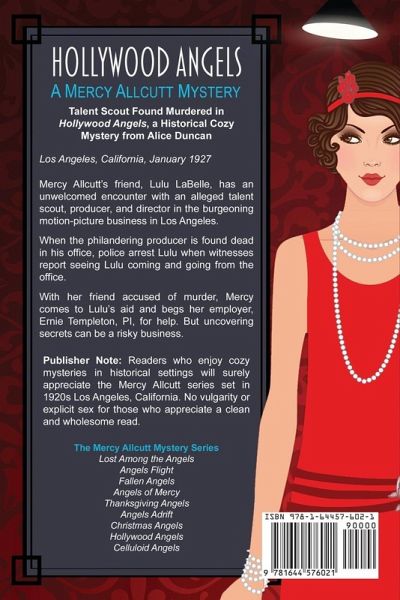 Talent Scout Found Murdered in Hollywood Angels, a Historical Cozy Mystery from Alice Duncan -1927, Los Angeles, California- Mercy Allcutt's friend, Lulu LaBelle, has an unwelcomed encounter with an alleged talent scout, producer, and director in the burgeoning motion-picture business in Los Angeles. When the philandering producer is found dead in his office, police arrest Lulu when witnesses report seeing Lulu coming and going from the office. With her friend accused of murder, Mercy comes to Lulu's aid and begs her employer, Ernie Templeton, PI, for help. But uncovering secrets can be a risky business. Publisher's Note: Readers who enjoy cozy mysteries in historical settings are sure to appreciate the Mercy Allcutt series set in 1920s Los Angeles, California. No vulgarity or explicit sex for those who appreciate a clean and wholesome read. Alice Duncan spent years avoiding what she knew she should be doing-writing-by professionally folk dancing instead. Eventually, her muse won the battle, and she's been crafting engaging historical cozy mysteries ever since. Now a proud resident of Roswell, New Mexico, Alice enjoys the lack of smog and crowds while spoiling her beloved herd of wild dachshunds. Visit her at aliceduncan.net. The Mercy Allcutt Mystery Series in Order Lost Among the Angels Angels Flight Fallen Angels Angels of Mercy Thanksgiving Angels Angels Adrift Christmas Angels Hollywood Angels Celluloid Angels Dancing Angels