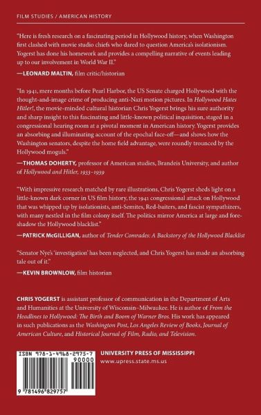 In September 1941, a handful of isolationist senators set out to tarnish Hollywood for warmongering. The United States was largely divided on the possibility of entering the European War, yet the immigrant moguls in Hollywood were acutely aware of the conditions in Europe. After Kristallnacht (the Night of Broken Glass), the gloves came off. Warner Bros. released the first directly anti-Nazi film in 1939 with Confessions of a Nazi Spy. Other studios followed with such films as The Mortal Storm (MGM), Man Hunt (Fox), The Man I Married (Fox), and The Great Dictator (United Artists). While these films represented a small percentage of Hollywood's output, senators took aim at the Jews in Hollywood who were supposedly "agitating us for war" and launched an investigation that resulted in Senate Resolution 152. The resolution was aimed at both radio and movies that "have been extensively used for propaganda purposes designed to influence the public mind in the direction of participation in the European War." When the Senate approved a subcommittee to investigate the intentions of these films, studio bosses were ready and willing to stand up against the government to defend their beloved industry. What followed was a complete embarrassment of the United States Senate and a large victory for Hollywood as well as freedom of speech. Many works of American film history only skim the surface of the 1941 investigation of Hollywood. In Hollywood Hates Hitler! Jew-Baiting, Anti-Nazism, and the Senate Investigation into Warmongering in Motion Pictures, author Chris Yogerst examines the years leading up to and through the Senate Investigation into Motion Picture War Propaganda, detailing the isolationist senators' relationship with the America First movement. Through his use of primary documents and lengthy congressional records, Yogerst paints a picture of the investigation's daily events both on Capitol Hill and in the national press.