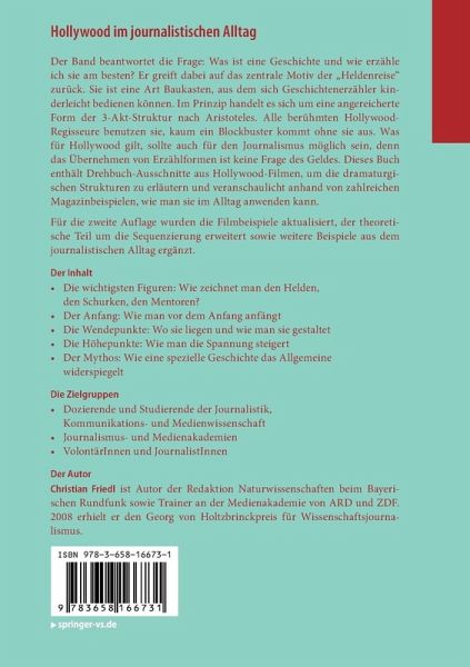 Der Band beantwortet die Frage: Was ist eine Geschichte und wie erzähle ich sie am besten? Er greift dabei das zentrale Motiv der "Heldenreise" auf. Sie ist eine Art Baukasten, aus dem sich Geschichtenerzähler kinderleicht bedienen können. Im Prinzip handelt es sich um eine angereicherte Form der 3-Akt-Struktur nach Aristoteles. Alle berühmten Hollywood-Regisseure benutzen sie, kaum ein Blockbuster kommt ohne sie aus. Was für Hollywood gilt, sollte auch für den Journalismus möglich sein, denn das Übernehmen von Erzählformen ist keine Frage des Geldes. Dieses Buch enthält Drehbuch-Ausschnitte aus Hollywood-Filmen, um die dramaturgischen Strukturen zu erläutern und veranschaulicht anhand von zahlreichen Beispielen aus Fernsehen, Hörfunk und Zeitung, wie man sie im Alltag anwenden kann.
