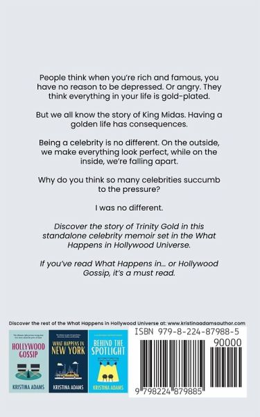 People think when you're rich and famous, you have no reason to be depressed. Or angry. They think everything in your life is gold-plated. But we all know the story of King Midas. Having a golden life has consequences. Being a celebrity is no different. On the outside, we make everything look perfect, while on the inside, we're falling apart. Why do you think so many celebrities succumb to the pressure? I was no different. Discover the story of Trinity Gold in this standalone celebrity memoir set in the What Happens in Hollywood Universe. If you've read What Happens in... or Hollywood Gossip, it's a must read.