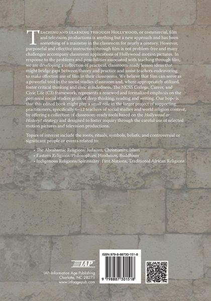 Teaching and learning through Hollywood, or commercial, film and television productions is anything but a new approach and has been something of a mainstay in the classroom for nearly a century. However, purposeful and effective instruction through film is not problem-free and many challenges accompany classroom applications of Hollywood motion pictures. In response to the problems and possibilities associated with teaching through film, we are developing a collection of practical, classroom-ready lesson ideas that might bridge gaps between theory and practice and assist teachers endeavoring to make effective use of film in their classrooms. We believe that film can serve as a powerful tool in the social studies classroom and, where appropriately utilized, foster critical thinking and civic mindedness. The NCSS College, Career, and Civic Life (C3) framework, represents a renewed and formalized emphasis on the perennial social studies goals of deep thinking, reading and writing. Our hope is that this edited book might play a small role in the larger project of supporting practitioners, specifically 6-12 teachers of social studies and world religion content, by offering a collection of classroom-ready tools based on the Hollywood or History? strategy and designed to foster inquiry through the careful use of selected motion pictures and television productions.Topics of interest include the roots, rituals, symbols, beliefs, and controversial or significant people or events related to:The Abrahamic Religions: Judaism, Christianity, Islam Eastern Religions/Philosophies: Hinduism, Buddhism Indigenous Religions/Spirituality: First Nations, Traditional African Religions