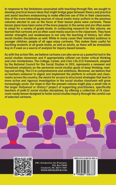 In response to the limitations associated with teaching through film, we sought to develop practical lesson ideas that might bridge gaps between theory and practice and assist teachers endeavoring to make effective use of film in their classrooms. One of the more interesting sources of visual media many authors in the previous volumes elected to use as the focus of their lesson plans were cartoons. These lesson plans have been some of the more popular in the series and are often easier to adapt for a variety of grade levels. In conducting research for this volume, we learned that cartoons are an often-used media sources in the classroom. They have similar strengths and weaknesses in not only the teaching of history, but other social studies disciplines as well. While in many cases their intended audience is younger children, people of all ages enjoy cartoons. This makes them useful for teaching students at all grade levels, as well as adults, as there will be immediate buy-in if used as a source of analysis for inquiry-based lessons. As with live action film, we believe cartoons can also serve as a powerful tool in the social studies classroom and if appropriately utilized can foster critical thinking and civic mindedness. The College, Career, and Civic Life (C3) framework, adopted by the National Council for the Social Studies in 2013, represents a renewed and formalized emphasis on the perennial social studies goals of deep thinking, reading and writing. The C3 is comprehensive and ambitious. Moreover, we believe that as teachers endeavor to digest and implement the platform in schools and classrooms across the country, the desire for access to structured strategies that lead to more active and rigorous investigation in the social studies classroom will grow increasingly acute. Our hope is that the present volume might play a small role in the larger Hollywood or History? project of supporting practitioners, specifically teachers of preK-12 social studies disciplines, by offering a collection of 19 classroom-ready lesson designed to foster social studies inquiry through the careful use of selected cartoons.