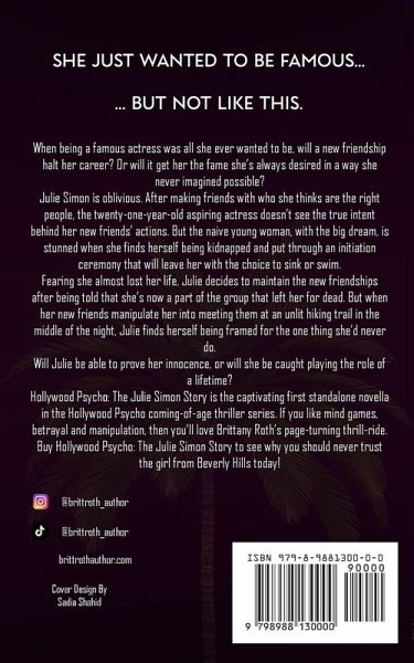 When being a famous actress was all she ever wanted to be, will a new friendship halt her career? Or will it get her the fame she's always desired in a way she never imagined possible? Julie Simon is oblivious. After making friends with who she thinks are the right people, the twenty-one-year-old aspiring actress doesn't see the true intent behind her new friends' actions. But the naive young woman, with the big dream, is stunned when she finds herself being kidnapped and put through an initiation ceremony that will leave her with the choice to sink or swim. Fearing she almost lost her life, Julie decides to maintain the new friendships after being told that she's now a part of the group that left her for dead. But when her new friends manipulate her into meeting them at an unlit hiking trail in the middle of the night, Julie finds herself being framed for the one thing she'd never do. Will Julie be able to prove her innocence, or will she be caught playing the role of a lifetime? Hollywood Psycho: The Julie Simon Story is the captivating first standalone novella in the Hollywood Psycho coming-of-age thriller series. If you like mind games, betrayal and manipulation, then you'll love Brittany Roth's page-turning thrill-ride. Buy Hollywood Psycho: The Julie Simon Story to see why you should never trust the girl from Beverly Hills today!