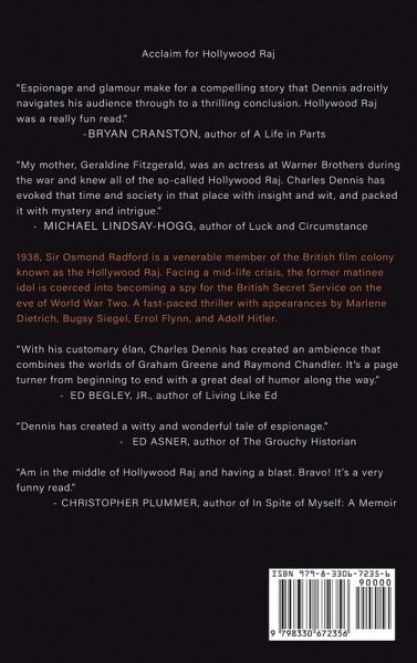 By 1938 the movie industry in Los Angles was so dominated by British talent that the collective group came to be known as the Hollywood Raj (a nod to Great Britain's colonization of India). With Beverly Hills and the environs populated by the likes of Ronald Colman, Herbert Marshall, C. Aubrey Smith, Cedric Hardwicke, Nigel Bruce and a younger generation represented by Cary Grant, Errol Flynn and David Niven, Sir Osmond Radford found himself adrift. The 50-year-old theatrical knight and former Great War flying ace had once been a successful matinee idol both in London and on Broadway. But his film career had never taken off, and his sole employment, albeit lucrative, was hosting a weekly radio show called "My Favorite Story". He yearns to play Sherlock Holmes - a role he toured in for years on stage - in the forthcoming Twentieth Century Fox production. He feels it will be the role of a lifetime. The actor-knight has no idea the role of a lifetime" is about to be presented to him by the British Secret Service. His former comrade-in-arms, Richard Ives-Curtis, recruits/blackmails him into service for "the Greater Good" to become Britain's eyes and ears in the film colony. With America pledged to remaining neutral in the impending European conflict, Los Angeles is becoming a hotbed for Nazi sympathizers and spies for Germany, Japan, and Italy. Ives-Curtis orders Radford to ferret out and make regular reports on any suspect espionage activities. Radford's new career as a spy is complicated by his colorful domestic life. His wife, Hyacinth, is a successful interior decorator whose clientele include moguls and movie stars. His oldest daughter, Flavia, is a flamboyant bi-sexual, who campaigns day and night for the role of Scarlett O'Hara in "Gone with the Wind". His middle child, Alec, is an avowed Nazi sympathizer, who embarks on an affair with "Hitler's honey", Leni Riefenstahl. His youngest daughter, Julia, has become pregnant by a married man, whom she appeared with in a Broadway flop. His brother, Jasper, is a total bounder, who becomes a drug dealer and incurs the wrath of mobsters Bugsy Siegel and Mickey Cohen. In addition to these real-life gangsters, the novel features appearances by other luminaries like Marlene Dietrich, Leslie Howard, David Niven, Errol Flynn, Samuel Goldwyn, and Orson Welles.