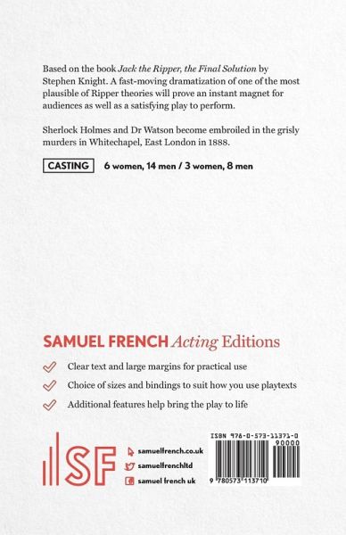 Based on the book Jack the Ripper, the Final Solution by Stephen Knight. A fast-moving dramatization of one of the most plausible of Ripper theories will prove an instant magnet for audiences as well as a satisfying play to perform. Sherlock Holmes and Dr Watson become embroiled in the grisly murders in Whitechapel, East London in 1888.