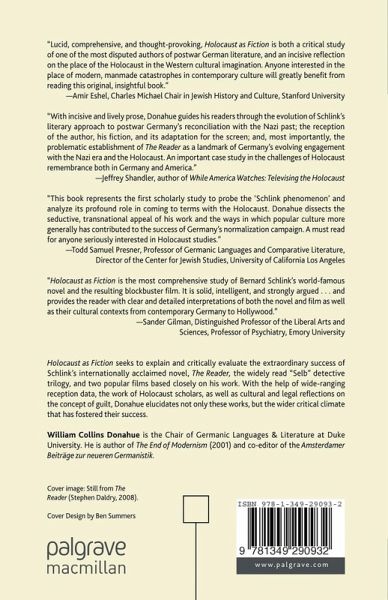 "William Collins Donahue's Holocaust as Fiction is the most comprehensive study of Bernard Schlink's world-famous novel and the resulting blockbuster film. It is solid, intelligent, and strongly argued. It reflects the critical literature on NS imagery in our time ably and provides the reader with clear and detailed interpretations of both the novel and film as well as their cultural contexts from contemproary Germany to Hollywood.' - Sander Gilman, Distinguished Professor of the Liberal Arts and Sciences, Professor of Psychiatry, Emory University, USA
