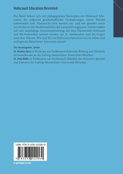 Der Band befasst sich mit pädagogischen Konzepten der Holocaust Education, die aufgrund gesellschaftlicher Veränderungen einem Wandel unterworfen sind. Historische Orte werden um- und neu gestaltet sowie Geschichte an die Medienvorlieben der Lernenden angepasst. Solchermaßen soll eine nachhaltige Auseinandersetzung mit dem Themenfeld Holocaust und NS-Verbrechen initiiert werden. Im 21. Jahrhundert sind die Fragen nach dem Warum, Wie und Wo von Holocaust Education neu zu stellen und vorliegender Band bietet Antworten darauf.