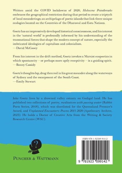 Written amid the COVID lockdowns of 2020, Holocene Pointbreaks embraces the geographical restriction during that period to create a triptych of local meanderings; an archipelago of poetic islands that link three unique ecologies located on the Countries of the Dharawal and Eora Nations. Goetz has an impressively developed historical consciousness, and his interest in the 'natural world' is profoundly informed by his understanding of the transnational forces that shape the modern concept of nature, especially the imbricated ideologies of capitalism and colonialism. - David McCooey From his interest in the drift method, Goetz invokes a Marxist ecopoetics in which spontaneity - or perhaps more aptly receptivity - is a guiding spirit. - Bonny Cassidy Goetz's thoughts lap, drag then roil in his great meander along the waterways of Sydney and the escarpment of the South Coast. - Emily Stewart