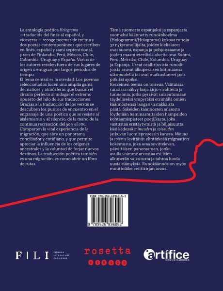 su/es Tämä suomesta espanjaksi ja espanjasta suomeksi käännetty runokokoelma (Hologrammi/Holograma) kokoaa runoja 32 nykyrunoilijalta, joiden kielialueet ovat suomi, espanja ja pohjoissaame ja joiden maantieteellisiä alueita ovat Suomi, Peru, Meksiko, Chile, Kolumbia, Uruguay ja Espanja. Useat osallistuvista runoilijoista asuvat alkuperäisen kotimaansa ulkopuolella tai ovat matkustaneet pois pitkiksi ajoiksi. Keskeinen teema on toiseus. Valituissa runoissa näkyy laaja kirjo vivahteita ja tunnelmia, jotka pyrkivät sulkeutumaan täydelliseksi ympyräksi etsimällä omien käännöstensä langan vastakkaista päätä. Säkeiden käännösten ansiosta löydetään hammasrattaiden hampaiden kohtaamispisteet poetiikasta, joka vastustaa eristäytymistä ja hiljaisuutta käsi kädessä minuuden ja toiseuden jatkuvan luomisprosessin kanssa. Minuus ja toiseus levittävät elintärkeää migraation kokemusta, joka avaa sovittelevan, päivittäisen panoraaman, jonka avulla voimme arvostaa esi-isien alkuperän vaikutusta ja tahtoa luoda uusia elämyksiä. Runokäännös on myös muuttoliike, reittikirjan avaus. La antología poética Holograma -traducida del finés al español, y viceversa- recoge poemas de treinta y dos poetas contemporáneos que escriben en finés, español y sami septentrional, y son de Finlandia, Perú, México, Chile, Colombia, Uruguay y España. Varios de los autores residen fuera de sus lugares de origen o emigran por largos periodos de tiempo. El tema central es la otredad. Los poemas seleccionados lucen una amplia gama de matices y atmósferas que buscan el círculo perfecto al indagar el extremo opuesto del hilo de sus traducciones. Gracias a la traducción de los versos se descubren los puntos de encuentro en el engranaje de una poética que se resiste al aislamiento y al silencio, de la mano de la continua recreación del yo y el otro. Comparten la vital experiencia de la migración, que abre un panorama conciliador y cotidiano, y que permite apreciar la influencia de los orígenes ancestrales y la voluntad de forjar nuevos destinos. La traducción poética también es una migración, es como abrir un libro de rutas.