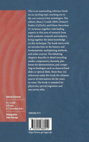Holographic Data Storage is an outstanding reference book on an exciting topic reaching out to the 21st century's key technologies. The editors, Hans J. Coufal (IBM), Demetri Psaltis (CalTech), and Glenn Sincerbox (University of Arizona), together with leading experts in this area of research from both academic research and industry, bring together the latest knowledge on this technique. The book starts with an introduction on the history and fundamentals, multiplexing methods, and noise sources. The following chapters describe in detail recording media, components, channels, platforms for demonstration, and competing technologies such as classical hard disks or optical disks. More than 700 references make this book the ultimate source of information for the years to come. The book is intended for physicists, optical engineers, and executives alike.