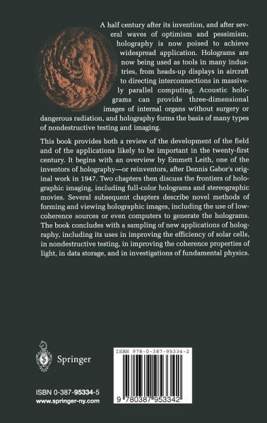 This book provides both a review of the development of the field and of the applications likely to be important in the 21st century. It begins with a review by Dennis Leith, one of the inventors of holography - or re-inventors, after Denis Gabor's original work in 1947. Two chapters discuss the frontiers of holographic imaging, including color holograms and stereographic movies. Several subsequent chapters describe novel methods of forming and viewing holographic images, including the use of low-coherence sources or even computers to generate the holograms. The book concludes with a sampling of new applications of holography, including its uses in improving the efficiency of solar cells, in nondestructive testing, in improving the coherence properties of light, in data storage, and in investigations of fundamental physics.