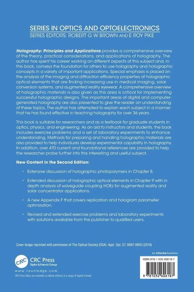 Preface for 2nd Edition 1.Introduction and Brief History of Holography 2.Background of Physical and Geometrical Optics for Holography. 3.Introduction to the Basic Concepts of Holography. 4.Holographic Image Formation. 5.Hologram Diffraction Efficiency. 6.Computer Generated Holograms. 7.Digital Holography. 8.Holographic Recording Materials. 9.Holographic Optical Elements and Instrument Applications. 10.Holographic Interferometry. 11.Holographic Displayes. 12.Holographic Data Storage. Appendix A: Mathematical Relations Appendix B: Practical Considerations for Hologram Construction Appendix C: Laser Operation and Properties Useful for Holography Appendix D: Holographic Material Processing Techniques Appendix E: Holography Lab Experiments Appendix F: Techniques for Accurate Fabrication of Volume Holographic Optical Elements Glossary