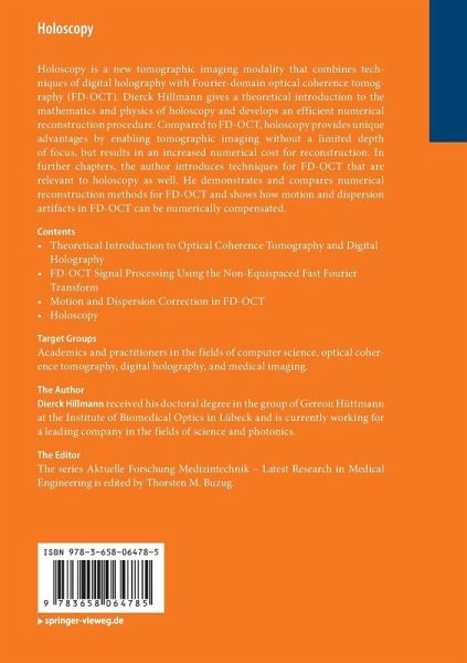 Holoscopy is a new tomographic imaging modality that combines techniques of digital holography with Fourier-domain optical coherence tomography (FD-OCT). Dierck Hillmann gives a theoretical introduction to the mathematics and physics of holoscopy and develops an efficient numerical reconstruction procedure. Compared to FD-OCT, holoscopy provides unique advantages by enabling tomographic imaging without a limited depth of focus, but results in an increased numerical cost for reconstruction. In further chapters, the author introduces techniques for FD-OCT that are relevant to holoscopy as well. He demonstrates and compares numerical reconstruction methods for FD-OCT and shows how motion and dispersion artifacts in FD-OCT can be numerically compensated.