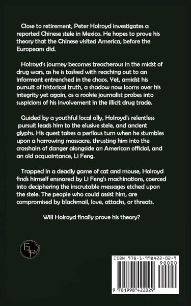 An award winning book by author Peter King, third book in the series. Close to retirement, Peter Holroyd investigates a reported Chinese stele in Mexico. He hopes to prove his theory that the Chinese visited America, before the Europeans did. Holroyd's journey becomes treacherous in the midst of drug wars, as he is tasked with reaching out to an informant entrenched in the chaos. Yet, amidst his pursuit of historical truth, a shadow now looms over his integrity yet again, as a rookie journalist probes into suspicions of his involvement in the illicit drug trade. Guided by a youthful local ally, Holroyd's relentless pursuit leads him to the elusive stele, and ancient glyphs. His quest takes a perilous turn when he stumbles upon a harrowing massacre, thrusting him into the crosshairs of danger alongside an American official, and an old acquaintance, Li Feng. Trapped in a deadly game of cat and mouse, Holroyd finds himself ensnared by Li Feng's machinations, coerced into deciphering the inscrutable messages etched upon the stele. The people who could assist him, are compromised by blackmail, love, attacks, or threats. Will Holroyd finally prove his theory?