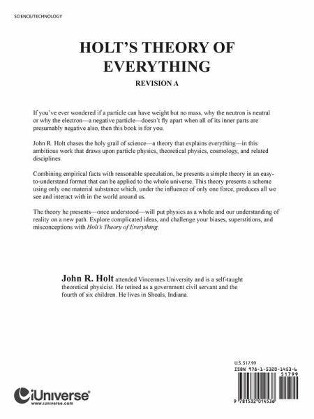 If youve ever wondered if a particle can have weight but no mass, why the neutron is neutral or why the electrona negative particledoesnt fly apart when all of its inner parts are presumably negative also, then this book is for you. John R. Holt chases the holy grail of sciencea theory that explains everythingin this ambitious work that draws upon particle physics, theoretical physics, cosmology, and related disciplines. Combining empirical facts with reasonable speculation, he presents a simple theory in an easy-to-understand format that can be applied to the whole universe. This theory presents a scheme using only one material substance which, under the influence of only one force, produces all we see and interact with in the world around us. The theory he presentsonce understoodwill put physics as a whole and our understanding of reality on a new path. Explore complicated ideas, and challenge your biases, superstitions, and misconceptions with Holts Theory of Everything.