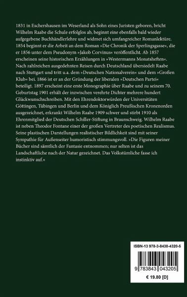 Wilhelm Raabe: Holunderblüte / Das letzte Recht. Zwei Erzählungen Holunderblüte: Entstanden zwischen November 1862 und Januar 1863. Ursprünglicher Titel: »Ein Ballkranz«. Das letzte Recht: Entstanden im Februar 1862. Ertdruck in »Westermann's illustrirten deutschen Monats-Heften«, 1862. Vollständige Neuausgabe mit einer Biographie des Autors. Herausgegeben von Karl-Maria Guth. Berlin 2015. Umschlaggestaltung von Thomas Schultz-Overhage unter Verwendung des Bildes: Childe Hassam, Blüten, 1883. Gesetzt aus Minion Pro, 11 pt. Über den Autor: 1831 in Eschershausen im Weserland als Sohn eines Juristen geboren, bricht Wilhelm Raabe die Schule erfolglos ab, beginnt eine ebenfalls bald wieder aufgegebene Buchhändlerlehre und widmet sich umfangreicher Romanlektüre. 1854 beginnt er die Arbeit an dem Roman »Die Chronik der Sperlingsgasse«, die er 1856 unter dem Pseudonym »Jakob Corvinus« veröffentlicht. Ab 1857 erscheinen seine historischen Erzählungen in »Westermanns Monatsheften«. Nach zahlreichen ausgedehnten Reisen durch Deutschland übersiedelt Raabe nach Stuttgart und tritt u.a. dem »Deutschen Nationalverein« und dem »Großen Klub« bei. 1866 ist er an der Gründung der liberalen »Deutschen Partei« beteiligt. 1897 erscheint eine erste Monographie über Raabe und zu seinem 70. Geburtstag 1901 erhält der inzwischen verehrte Dichter mehrere hundert Glückwunschschreiben. Mit den Ehrendoktorwürden der Universitäten Göttingen, Tübingen und Berlin und dem Königlich Preußischen Kronenorden ausgezeichnet, erkrankt Wilhelm Raabe 1909 schwer und stirbt 1910 als Ehrenmitglied der Deutschen Schiller-Stiftung in Braunschweig. Wilhelm Raabe ist neben Theodor Fontane einer der großen Vertreter des poetischen Realismus. Seine plastischen Darstellungen realistischer Bildlichkeit sind mit seiner Sympathie für Außenseiter humoristisch stimmungsvoll. »Die Figuren meiner Bücher sind sämtlich der Fantasie entnommen; nur selten ist das Landschaftliche nach der Natur gezeichnet. Das Volkstümliche fasse ich instinktiv auf.«
