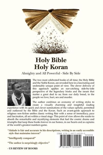 The two most celebrated books of all time; the Holy Bible and the Noble Koran, are revealed here in a fascinating and undeniably unique point of view. The clever delivery of this approach applies an eye-catching, side-by-side perspective of the legendary books and the issues that matter a great deal to us; from our daily bread, to the people we love, hurt, sex and murder. The author combines an economy of writing styles to create a charming and insightful reading experience with quick and clever summations of the values upheld, permitted and outlawed by the Bible and the Koran. Such an avant-garde approach to religious non-fiction unifies classic writing flair with a sense of pace and fascination. This point of view allows the reader to absorb the remarkable and mystifying elements that fuel the cosmic drama and the triumphs that keep these books forever in our homes, in our hearts, and as captains of the world's greatest numbers game.
