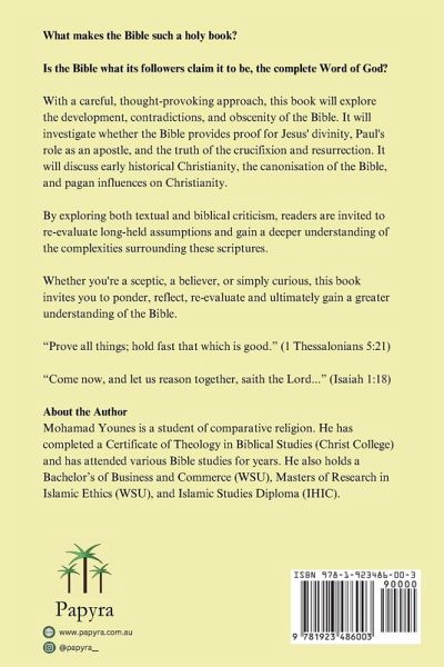 What makes the Bible a holy book, and is it truly the complete Word of God? This book offers a critical and scholarly examination of the Bible's composition, contradictions, and moral content. It explores whether the Bible provides clear evidence for the divinity of Jesus, the apostleship of Paul, and the historical truth of the crucifixion and resurrection. Topics covered include early Christianity, the canonisation process, and the influence of surrounding pagan cultures. Combining textual and biblical criticism, the author invites readers to reassess foundational Christian claims and reflect on the historical and theological development of scripture. This work is suited for students of religion, interfaith scholars, and readers seeking a rational and evidence-based perspective on Christianity's sacred texts.