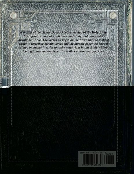 A reprint of the classic Douay-Rheims version of the Holy Bible. This reprint is more of a reference and study tool rather than a devotional Bible. The verses all begin on their own lines to make it easier to reference certain verses and the durable paper the book is printed on makes it easier to make notes right in this Bible without having to markup that beautiful leather edition that you keep.