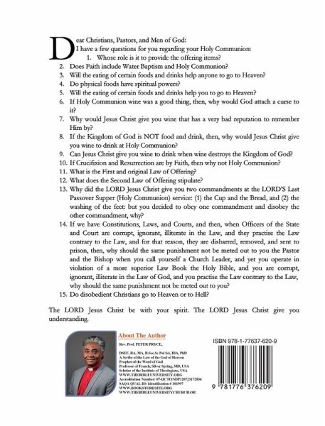 Dear Christians, Pastors, and Men of God:I have a few questions for you regarding your Holy Communion:Whose role is it to provide the offering items? Does Faith include Water Baptism and Holy Communion? Will the eating of certain foods and drinks help anyone to go to Heaven? Do physical foods have spiritual powers? Will the eating of certain foods and drinks help you to go to Heaven? If Holy Communion wine was a good thing, then, why would God attach a curse to it? Why would Jesus Christ give you wine that has a very bad reputation to remember Him by? If the Kingdom of God is NOT food and drink, then, why would Jesus Christ give you wine to drink at Holy Communion? Can Jesus Christ give you wine to drink when wine destroys the Kingdom of God? If Crucifixion and Resurrection are by Faith, then why not Holy Communion? What is the First and original Law of Offering? What does the Second Law of Offering stipulate? Why did the LORD Jesus Christ give you two commandments at the LORD'S Last Passover Supper (Holy Communion) service: (1) the Cup and the Bread, and (2) the washing of the feet: but you decided to obey one commandment and disobey the other commandment, why? If we have Constitutions, Laws, and Courts, and then, when Officers of the State and Court are corrupt, ignorant, illiterate in the Law, and they practise the Law contrary to the Law, and for that reason, they are disbarred, removed, and sent to prison, then, why should the same punishment not be meted out to you the Pastor and the Bishop when you call yourself a Church Leader, and yet you operate in violation of a more superior Law Book the Holy Bible, and you are corrupt, ignorant, illiterate in the Law of God, and you practise the Law contrary to the Law, why should the same punishment not be meted out to you? Do disobedient Christians go to Heaven or to Hell? The LORD Jesus Christ be with your spirit. The LORD Jesus Christ give you understanding.Rev. Prof. PETER PRYCE,DSEF, BA, MA, B.Soc.Sc Pol Sci, IBA, PhDA Scribe of the Law of the God of HeavenProphet of the Word of God