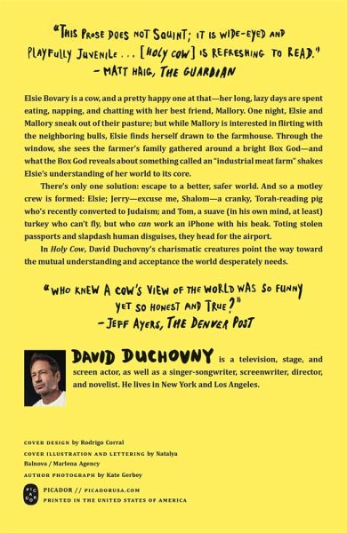 A rollicking, globe-trotting adventure with a twist: a four-legged heroine you won't soon forget. Elsie Bovary is a cow, and a pretty happy one at that-her long, lazy days are spent eating, napping, and chatting with her best friend, Mallory. One night, Elsie and Mallory sneak out of their pasture; but while Mallory is interested in flirting with the neighboring bulls, Elsie finds herself drawn to the farmhouse. Through the window, she sees the farmer's family gathered around a bright Box God-and what the Box God reveals about something called an "industrial meat farm" shakes Elsie's understanding of her world to its core. There's only one solution: escape to a better, safer world. And so a motley crew is formed: Elsie; Jerry-excuse me, Shalom-a cranky, Torah-reading pig who's recently converted to Judaism; and Tom, a suave (in his own mind, at least) turkey who can't fly, but who can work an iPhone with his beak. Toting stolen passports and slapdash human disguises, they head for the airport. Elsie is our wisecracking, pop-culture-reference-dropping, slyly witty narrator; Tom-who does eventually learn to fly (sort of)-dispenses psychiatric advice in a fake German accent; and Shalom, rejected by his adopted people in Jerusalem, ends up unexpectedly uniting Israelis and Palestinians. In Holy Cow, David Duchovny's charismatic creatures point the way toward a mutual understanding and acceptance that the world desperately needs.