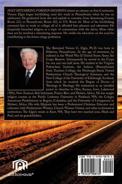 HOLY HITCHIKING FOREIGN HIGHWAYS relates an odyssey on four Continents. Vernon Elgin began hitchhiking rural dirt roads in Pennsylvania when he was an adolescent. He graduated from dirt and asphalt to concrete, from Armstrong County Route 210, to Pennsylvania Route 422, to U.S. Route 66. Most of his hitchhiking conveyed him to work or college; all of it afforded him pleasure and adventure. He frequently broached religion as a topic of conversation with the driver. More often than not he received a stimulating response. He credits his education on the road for contributing to his future clergy profession.
