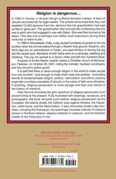 When you think of saints, you envision stained-glass pictures of piety. But the truth can be horribly different. Consider Saint Pius V: As Grand Inquisitor, he sent Catholic troops to kill 2,000 Waldensian Protestants in southern Italy. After becoming pope, he sent Catholic troops to kill Huguenot Protestants in France. Pius also launched the final crusade against Muslims, sending a Christian naval armada to slaughter thousands in the Battle of Lepanto in 1571. And, he intensified the Roman Inquisition, torturing and burning Catholics whose beliefs varied from official dogma. After his death, Pius was canonized a saint. Heaven help us.Holy Horrors chronicles the grim spectrum of religious persecution from ancient times to the present, including such historic massacres as the Crusades, the Islamic jihads, the Catholic wars against heretics, the Inquisition, witch hunts, the Reformation, and such atrocities as the Holocaust, the seemingly insoluble Catholic-Protestant schism in Northern Ireland, religious tribalism in Lebanon, and the barbaric cruelty of the theocracy in Iran. The antique woodcuts, paintings, prints, and contemporary photographs that illustrate the book are at once gruesome and riveting.