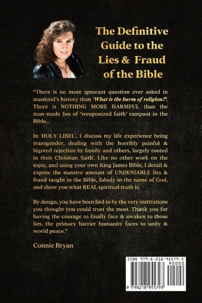 "There is no more ignorant question ever asked in mankind's history than 'What is the harm of religion?'. There is NOTHING MORE HARMFUL than the man-made lies of 'weaponized faith' rampant in the Bible... In 'HOLY LIBEL', I discuss my life experience being transgender, dealing with the horribly painful & bigoted rejection by family and others, largely rooted in their Christian 'faith'. Like no other work on the topic, and using your own King James Bible, I detail & expose the massive amount of UNDENIABLE lies & fraud taught in the Bible, falsely in the name of God, and show you what REAL spiritual truth is. By design, you have been lied to by the very institutions you thought you could trust the most. Thank you for having the courage to finally face & awaken to those lies, the primary barrier humanity faces to unity & world peace." Connie Bryan