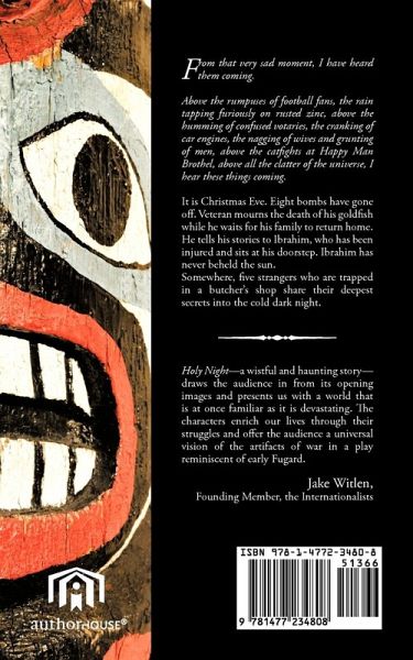 IT IS CHRISTMAS EVE . EIGHT BOMBS HAVE GONE OFF.VETERAN MOURNS THE DEATH OF HIS GOLDFISH WHILE HE WAITS FOR HIS FAMILY TO RETURN HOME. HE TELLS HIS STORIES TO IBRAHIM,WHO HAS BEEN INJURED ANDSITS AT HIS DOOR STEP, WHO ALSO, HAS NEVER SEEN THE SUN. SOMEWHERE ELSE, FIVE STRANGERS WHO ARE TRAPPED IN A BUTCHER'S SHOP SHARE THEIR DEEPEST SECRETS INTO THE COLD DARK NIGHT