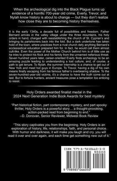 It is the early 1340s, a decade full of possibilities and freedom. Father Bernard arrives in the valley village under the three mountains, his holy orders in hand, charged with reestablishing the church of St. Cyprian's and bringing its parishioners back into the fold. But a dark undertone has taken hold of the town, where practices from a rival church defy anything Bernard's ecclesiastical education prepared him for. In fact, he would call them almost cult-like. Even the power of the Mother Church behind him is of little use as he tries to protect his flock and his family from the unnamed nefarious threat. Seven hundred years later, career-oriented Everly finds archeology to be an amazing puzzle leading to understanding a lost culture, and, of course, a path to get tenure. To Nylah, the summer internship is a chance to get out of New York and meet hot guys in Europe. To Trevor, having a dig of his own means finally escaping from his famous father's overbearing shadow. To the seven-hundred-year-old victims, it's a chance to have the truth come out at last. But to fortune hunters, ancient treasures pose a temptation too enticing to resist.