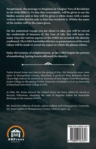 Paraphrased, the message to Pergamos in Chapter Two of Revelation in the Holy Bible is: To him that overcometh, will be given to eat the hidden manna and to him will be given a white stone with a name written within known only to him that receiveth it. Within the name of the Author will be the name given. On the numerical voyage you are about to take, you will be served the credentials of Immanu-el, the Tree of Life. You will learn the many ways the various aspects of the LORD are revealed: His identity confirmed. The LORD has hidden His face so permutations of the word values will be made to reveal the aspect to which the phrase relates. Enjoy this journey of enlightenment, as the LORD begins the process of manifesting, having herein affirmed His identity.