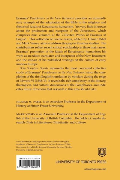 Erasmus' Paraphrases on the New Testament provide a startling example of the adaptation of the Bible to the religious and rhetorical ideals of Renaissance humanism. Yet very little is known about the production and reception of the Paraphrases, which comprise nine volumes of the Collected Works of Erasmus in English. In this collection of twelve contributed essays, Hilmar Pabel and Mark Vessey aim to address this gap in Erasmus studies. The papers reflect recent critical scholarship in three main areas: Erasmus' promotion of the ideals of Renaissance humanism; his work as an editor, translator, and interpreter of the New Testament; and the impact of his published writings on the culture of early modern Europe. Holy Scripture Speaks represents the most concerted collective study of Erasmus' Paraphrases on the New Testament since the completion of the first English translation by scholars during the reign of Edward VI (1548/9). It reveals the rich complexity of the literary, theological, and cultural dimensions of the Paraphrases, and indicates future directions that research in this area should take.