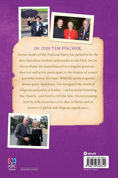 As the first Australian Ambassador to the Holy See tim Fischer is is the unique position of being able to tell what it's really like in the seat of power in Rome. Here he reflects on his time in the Vatican, the details which made up his life, the protocols, the people and also on the role that religion still has to play in the lives of future generations. Appointed by Kevin Rudd in 2009, tim found himself in the singular world of Vatican diplomacy, where, even more than most diplomatic circles, the right word in the right ear is an essential artform, and where the person sitting next to you at dinner could be Colonel Gadafi or the Pope. Armed with the skills he learned as an activist politician - and with his trusty black Akubra - tim learned to navigate this strange new world and has lived to tell the tale!
