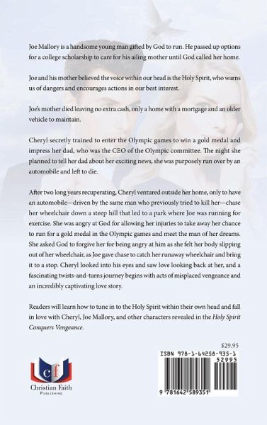 Joe Mallory is a handsome young man gifted by God to run. He passed up options for a college scholarship to care for his ailing mother until God called her home. Joe and his mother believed the voice within our head is the Holy Spirit, who warns us of dangers and encourages actions in our best interest. Joe's mother died leaving no extra cash, only a home with a mortgage and an older vehicle to maintain. Cheryl secretly trained to enter the Olympic games to win a gold medal and impress her dad, who was the CEO of the Olympic committee. The night she planned to tell her dad about her exciting news, she was purposely run over by an automobile and left to die. After two long years recuperating, Cheryl ventured outside her home, only to have an automobile-driven by the same man who previously tried to kill her-chase her wheelchair down a steep hill that led to a park where Joe was running for exercise. She was angry at God for allowing her injuries to take away her chance to run for a gold medal in the Olympic games and meet the man of her dreams. She asked God to forgive her for being angry at him as she felt her body slipping out of her wheelchair, as Joe gave chase to catch her runaway wheelchair and bring it to a stop. Cheryl looked into his eyes and saw love looking back at her, and a fascinating twists-and-turns journey begins with acts of misplaced vengeance and an incredibly captivating love story. Readers will learn how to tune in to the Holy Spirit within their own head and fall in love with Cheryl, Joe Mallory, and other characters revealed in the Holy Spirit Conquers Vengeance.