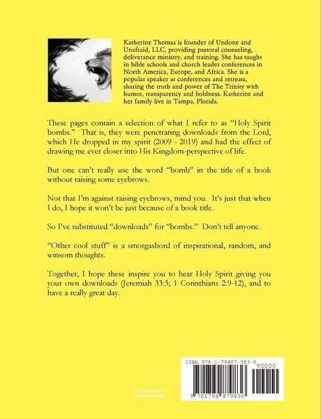 These pages contain a selection of what I refer to as "Holy Spirit bombs." That is, they were penetrating downloads from the Lord, which He dropped in my spirit (2009 - 2019) and had the effect of drawing me ever closer into His Kingdom-perspective of life. But one can't really use the word "bomb" in the title of a book without raising some eyebrows. Not that I'm against raising eyebrows, mind you. It's just that when I do, I hope it won't be simply because of a book title. So I've substituted "downloads" for "bombs." Don't tell anyone. "Other cool stuff" is a smorgasbord of inspirational, random, and winsome thoughts. Together, I hope these inspire you to hear Holy Spirit giving you your own downloads (Jeremiah 33:3; 1 Corinthians 2:9-12), and to have a really great day.