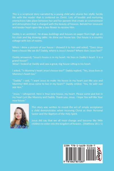 This is a scriptural story narrated by a young child who shares her idyllic family life with the reader that is centered on Christ. Lots of lovable and nurturing interactions take place between her and her parents that create an environment and atmosphere that is charged with the beauty of heaven. Behold her innocent and tender heart open like a rare flower to receive Him. Daddy is an architect. He draws buildings and houses on paper from high up on his chair and big drawing table. He drew our house too. Our house is a country cottage with lots of rooms. When I drew a picture of our house I showed it to him and asked, "Does Jesus have a house like we do? Daddy, where is Jesus's house? Where does Jesus live?" Daddy answered, "Jesus's house is in my heart. He lives in Daddy's heart. It is a grand house!" Wow! I looked at Daddy and saw a great, big house sitting in his heart. I asked, "Is Mommy's heart Jesus's house too?" Daddy replied, "Yes, Jesus lives in Mommy's heart too." "Daddy," I said, "I want Jesus to make His house in my heart just like you and Mommy! Will Jesus come to live in my heart?" Daddy smiled. "Yes, He will! Just ask Him." "Jesus," I whispered. Here is Your new house, my heart. Please come and live in my heart just like Mommy and Daddy. Thank you, Jesus. I hope You will like Your new house." This story was written to reveal the act of simple acceptance a child demonstrates when receiving Christ as their Personal Savior and the Baptism of the Holy Spirit. Jesus did say that we all must change and become like little children to enter into the kingdom of heaven...(Matthew 18:1-5)