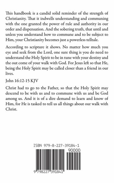 This handbook is a candid solid reminder of the strength of Christianity. That it indwells understanding and communing with the one granted the power of rule and authority in our order and dispensation. And the sobering truth, that until and unless you understand how to commune and to be subject to Him, your Christianity becomes just a powerless telltale. According to scripture it shows. No matter how much you eye and seek from the Lord, one sure thing is you do need to understand the Holy Spirit to be in tune with your destiny and the out come of your walk with God. For Jesus left so that He, being the Holy Spirit may be called closer than a friend in our lives. John 16:12-15 KJV Christ had to go to the Father, so that the Holy Spirit may descend to be with us and to commune with us and be God among us. And it is of a dire demand to learn and know of Him, for He is tasked to tell us all things about our walk with Christ.