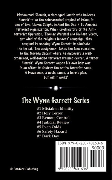 Wynn Garrett is back, terrorizing the terrorists! Muhammad Shaweh, a deranged lunatic who believes himself to be the reincarnated prophet of Islam, is one of five Islamic Caliphs behind the Death To America terrorist organization. When co-directors of the Anti-terrorist Operation, Thomas Wardahl and Richard Scorby, get wind of the religious leaders' campaign, they respond by sending Wynn Garrett to eliminate the threat. The assignment takes the lone operative to the Nevada desert where he discovers a well-organized, well-funded terrorist training center. A target himself, Wynn Garrett wages his own holy war in an effort to destroy the entire terrorist camp. A brave man, a noble cause, a heroic plan, but will it work? "My favorite new series!" Download your copy today!